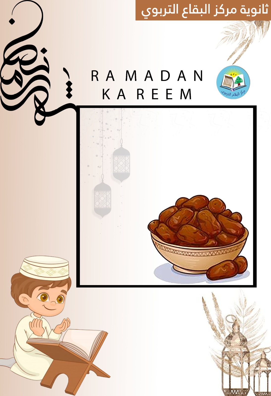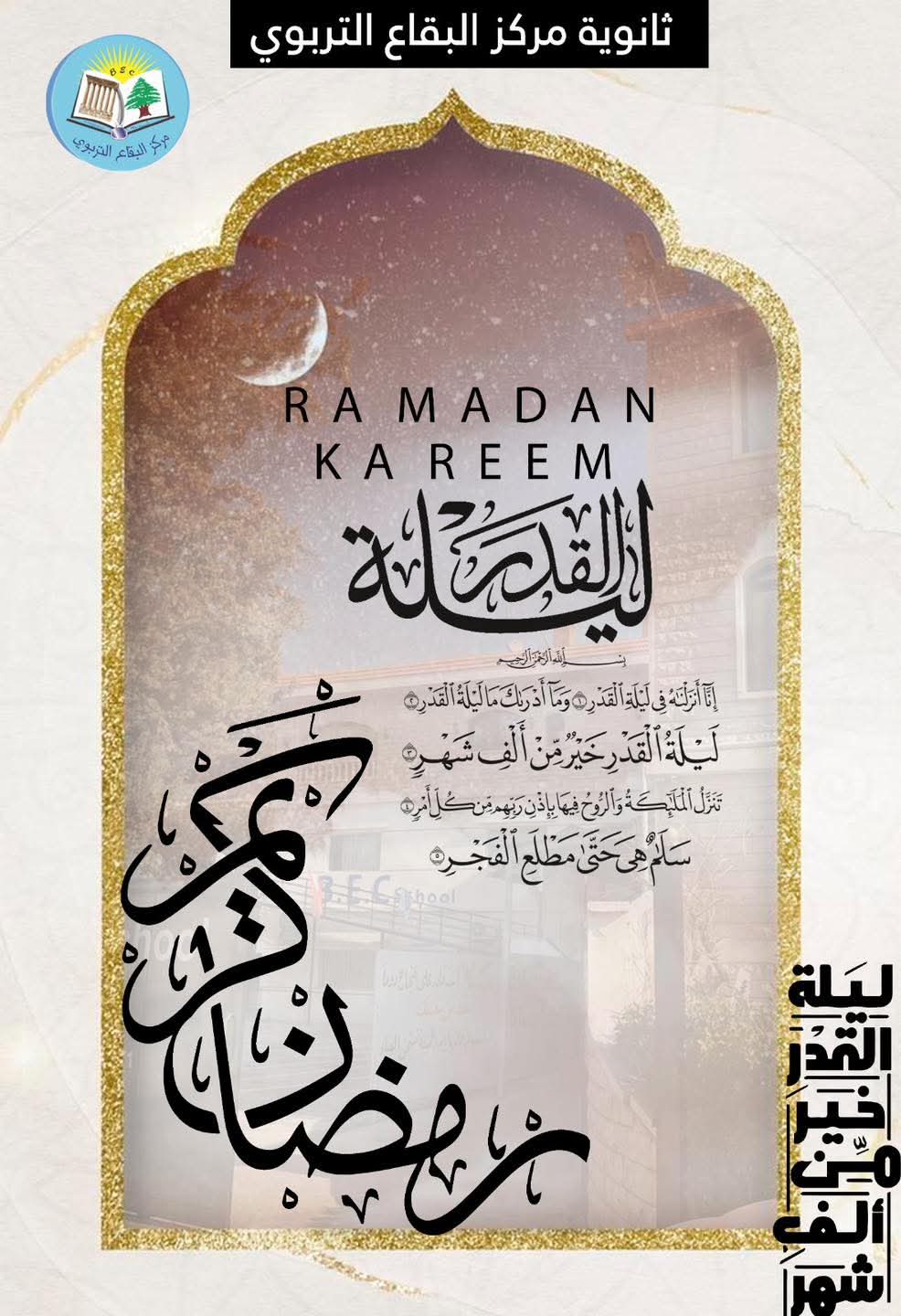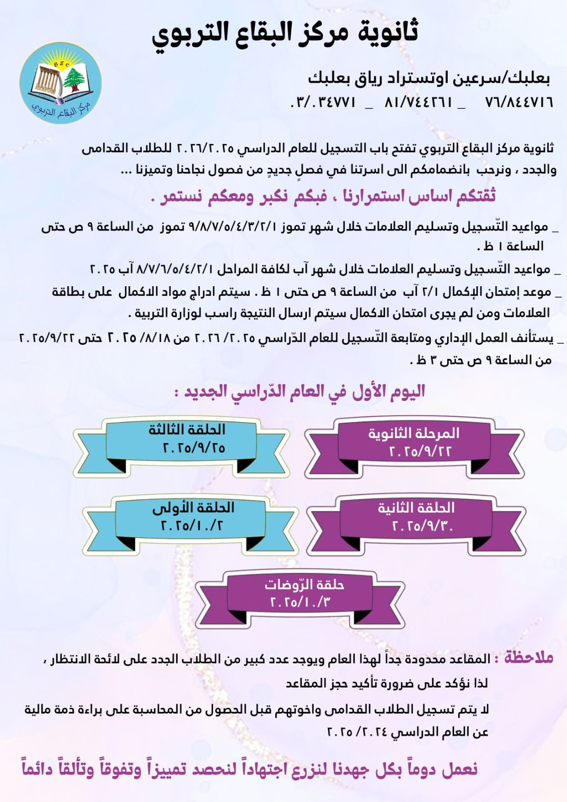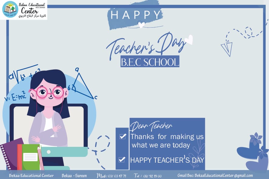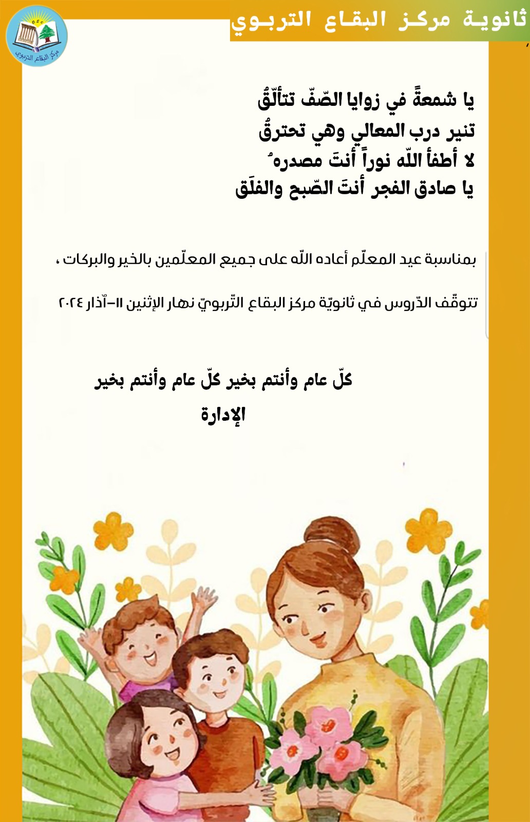 أسرتي في ثانوية مركز البقاع التّربوي... في نهاية محطّتنا لهذا العام، أتقدّم منكم بجزيل الشّكر والإمتنان على كلّ ما قدّمتموه خلال هذا العام، فشكراً لكم على صبركم وتحمّلكم وتعاونكم وعملكم المتواصل، وسعيكم الحثيث من أجل مصلحة المدرسة والطلّاب، فبكم نرتقي ونتقدّم، وبعملكم نتميّز، وعليكم نعوّل بخطواتنا القادمة... كلّ عامٍ وأنتم بخير، على أمل اللّقاء في العام القادم بعزمٍ وشغفٍ جديد...