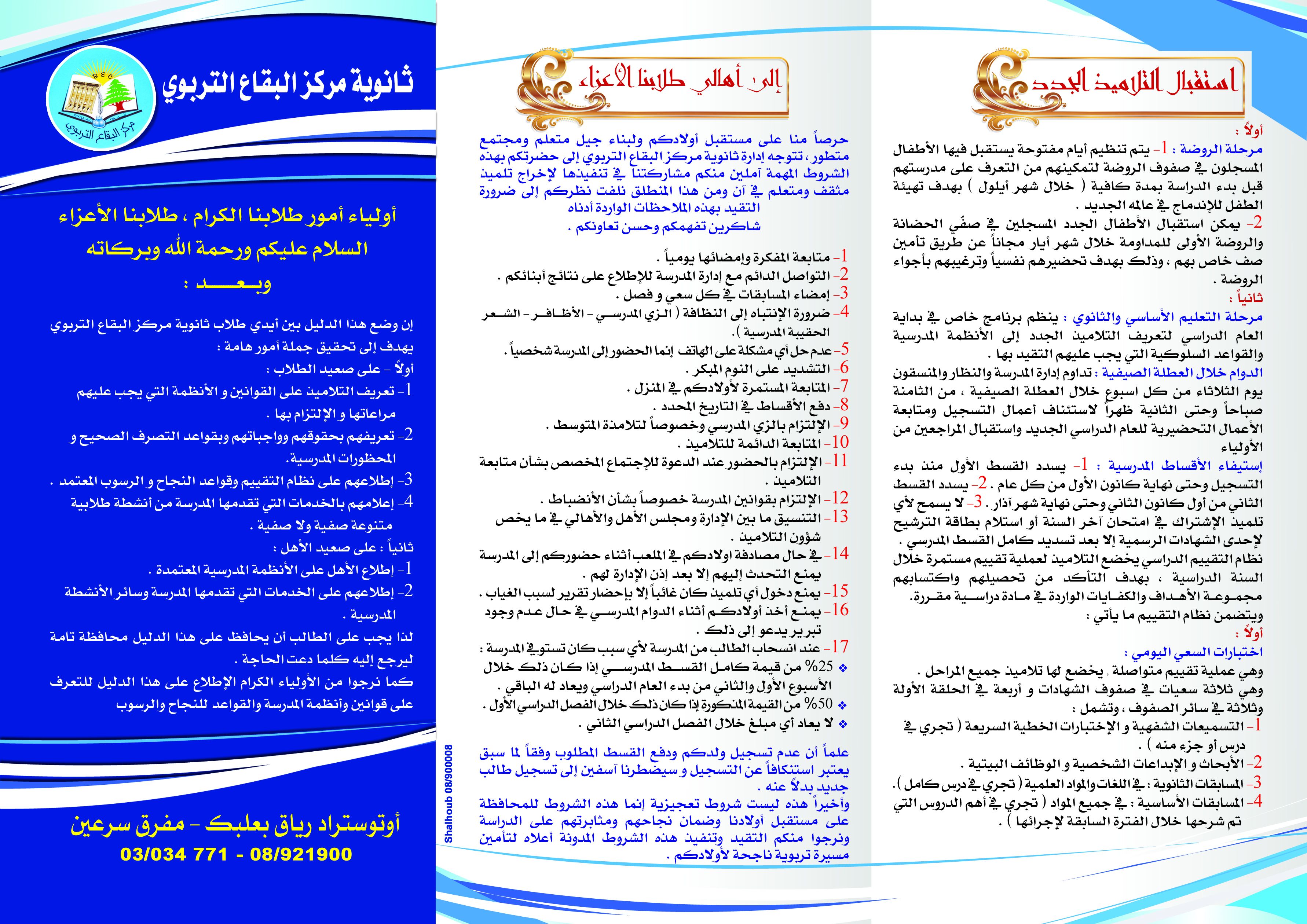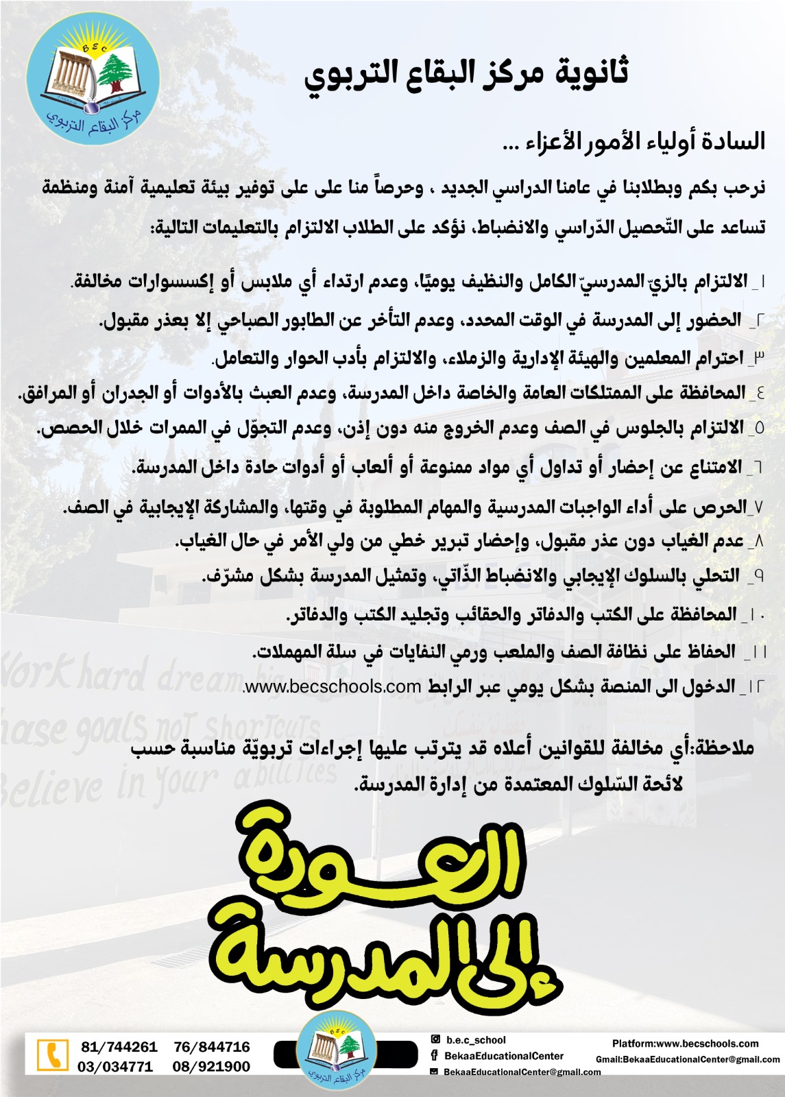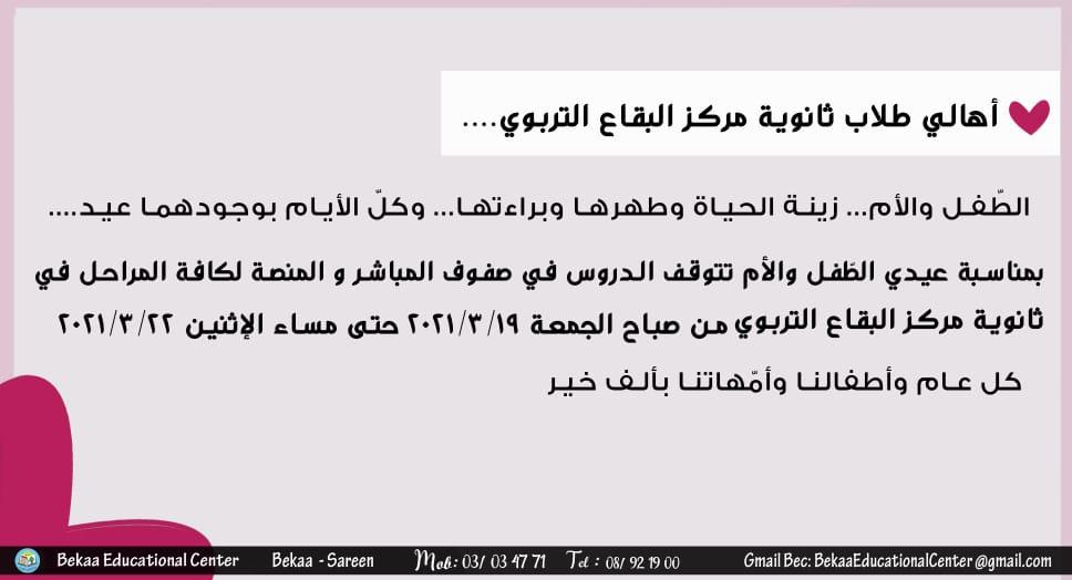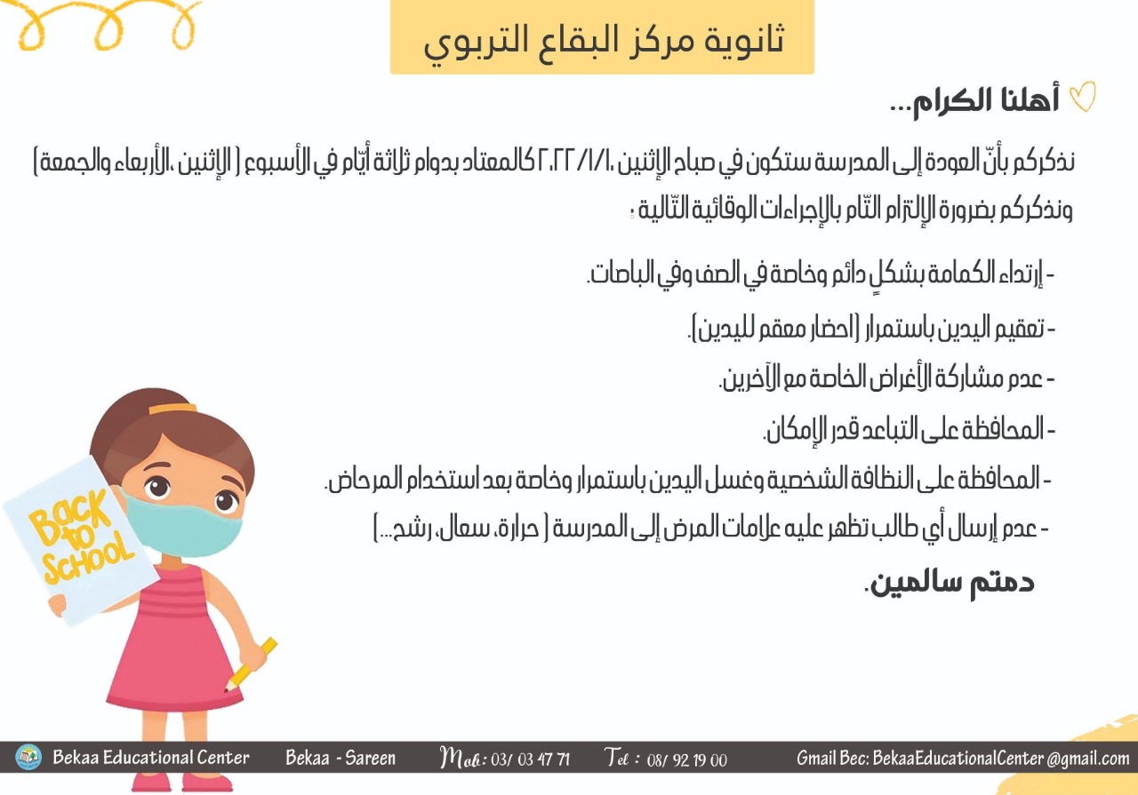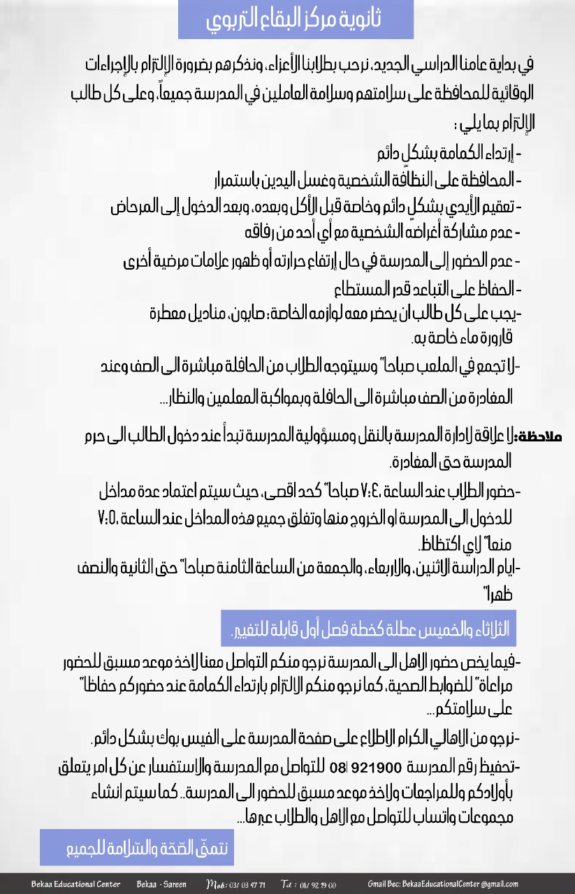 أسرة ثانوية مركز البقاع التّربوي السلام عليكم ورحمة الله وبركاته نطلب من الله أن تكونوا جميعاً بألف خير وأن تكونوا كما عهدناكم دوماً أقوياء أشداء. يتراود على مسامعنا جميعاً قرارات لوزير التربية حول ضرورة انطلاق العام الدراسي حضوريّاً او حتى عن بعد كل مدرسة بحسب موقعها. يهمّ إدارة المدرسة أن تلفت انتباهكم إلى أنّنا غير ملتزمين بكل تلك القرارات.ليس لعدم توفّر القدرات او الإمكانيات المساعدة على سير العملية التعليمية بل لأسباب أخرى باتت واضحة أمامنا. في ما يخصّ التعليم الحضوري المدرسة بكادريها ا