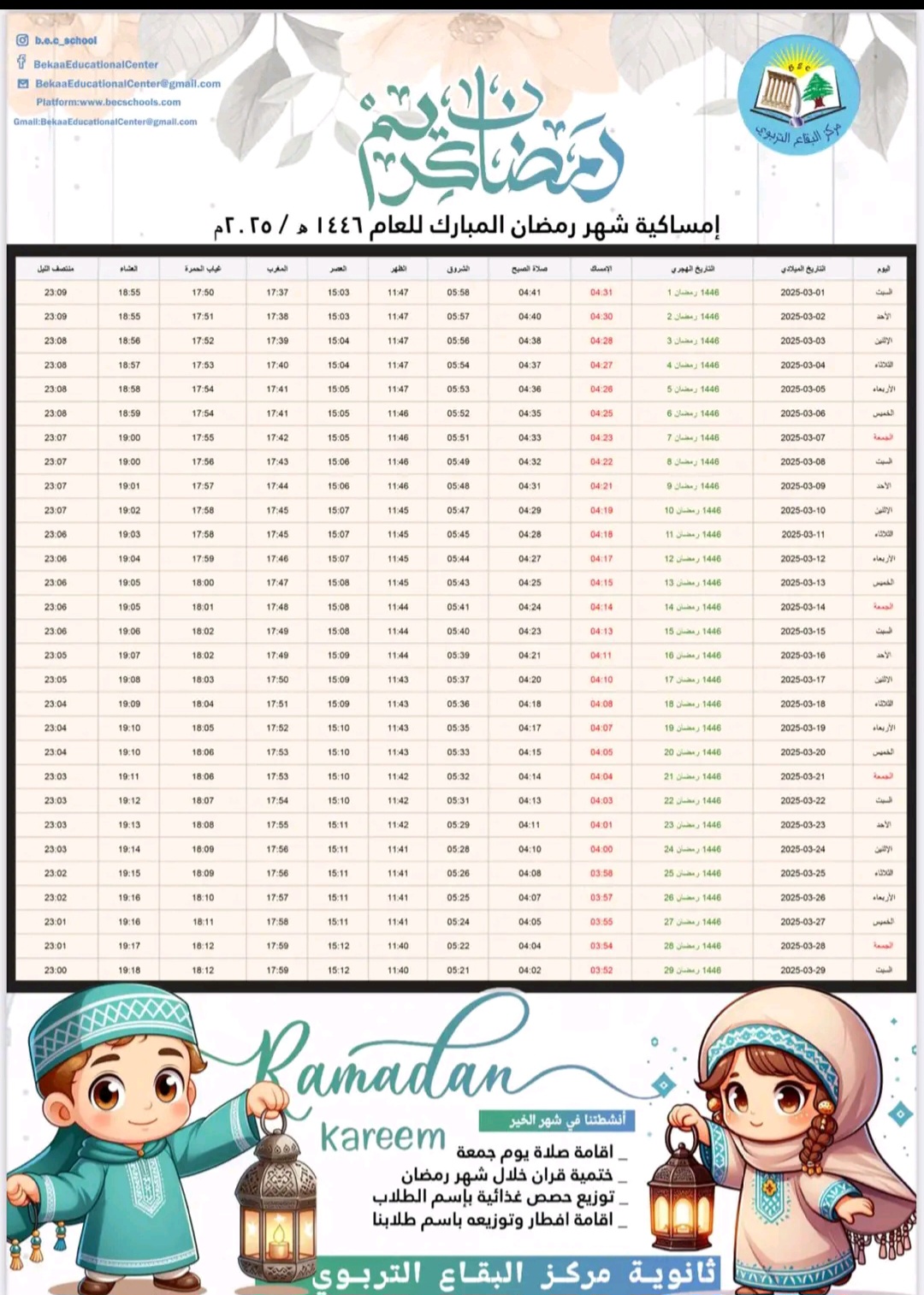 امساكية شهر رمضان